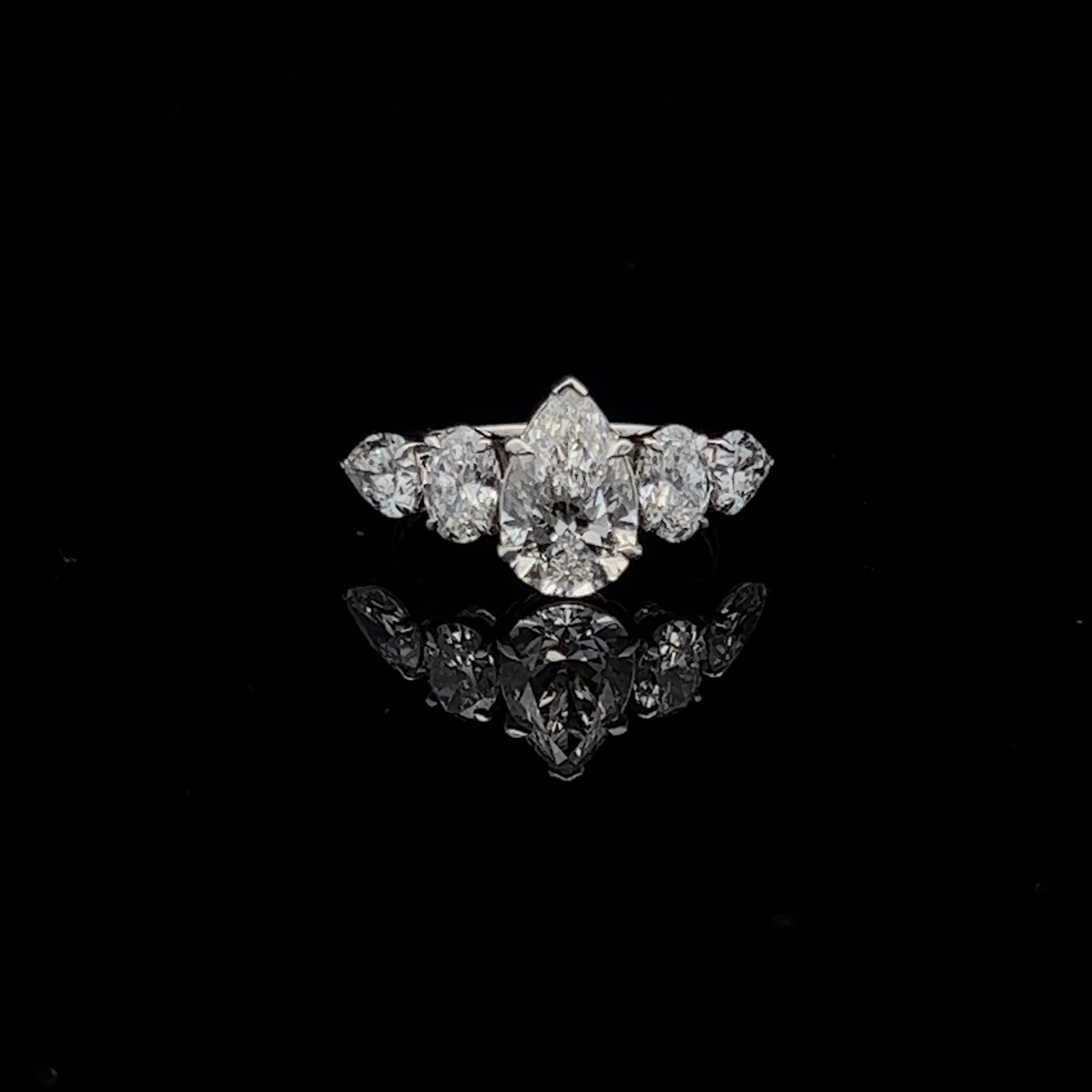 This stunning diamond ring features a captivating pear-shaped center stone, elegantly flanked by oval brilliant diamonds. It exudes timeless beauty and sophistication, making it the perfect symbol of eternal love.