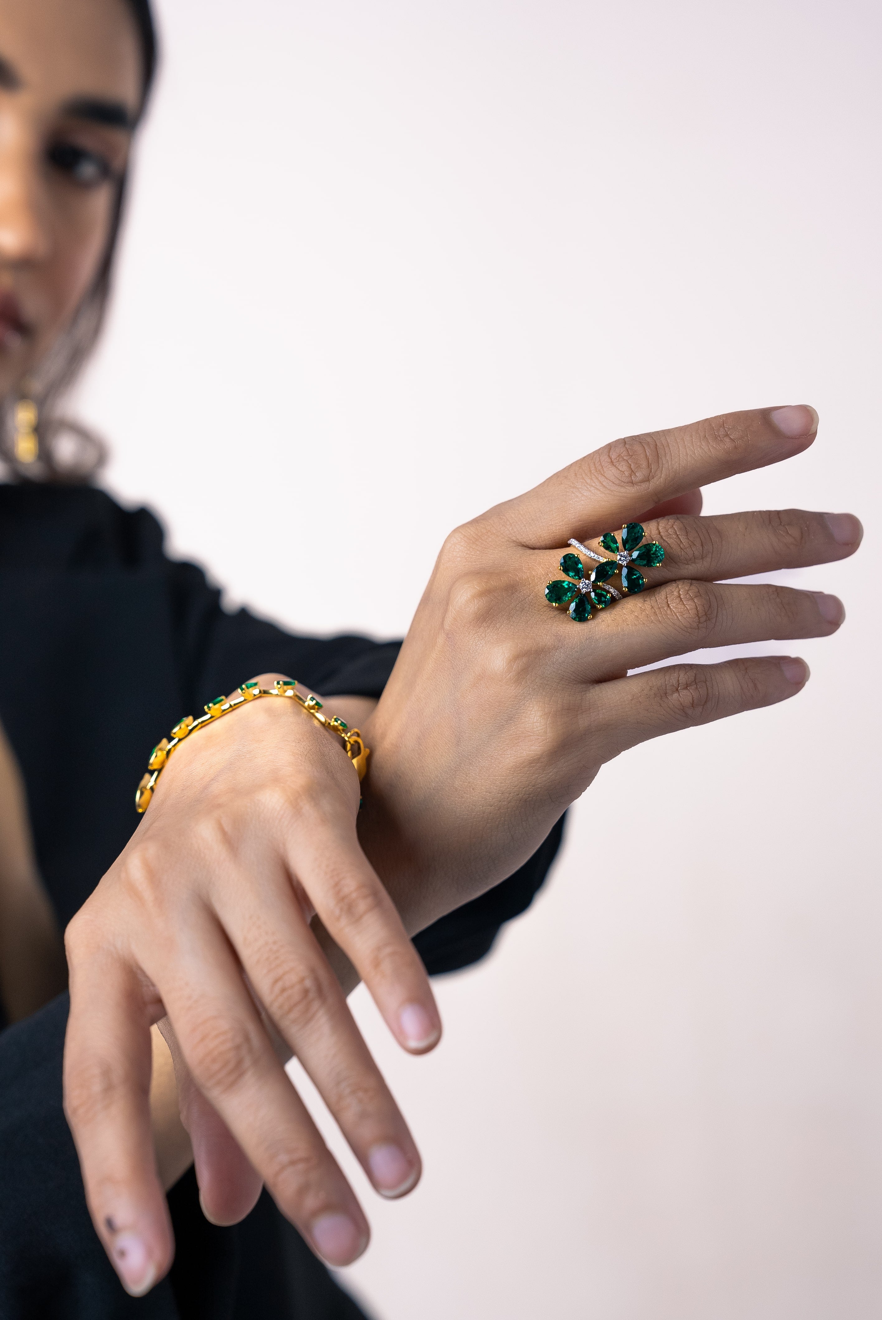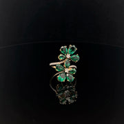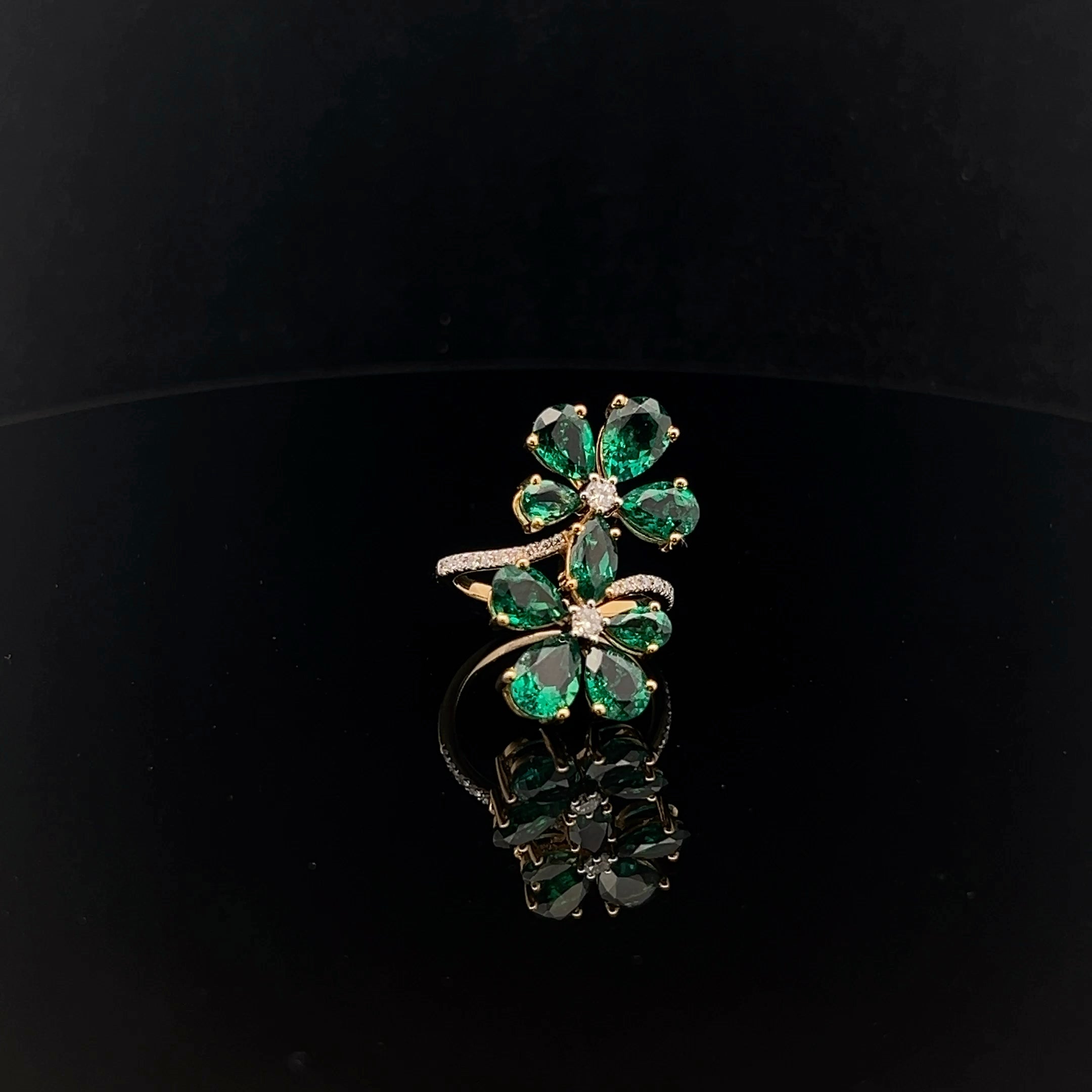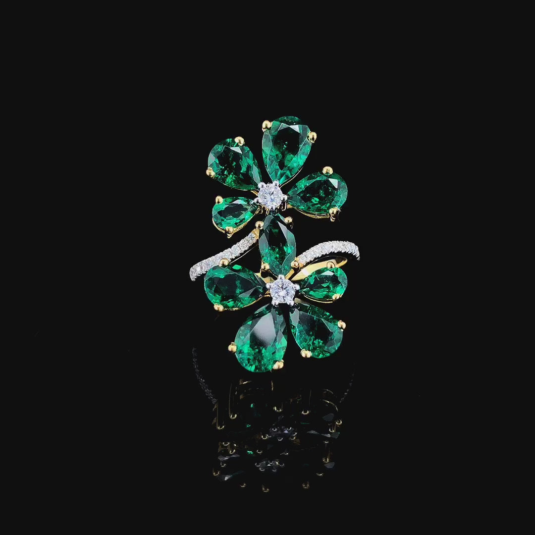 This exquisite ring features an elegant floral design with radiant emerald gemstones. Each petal is meticulously crafted to highlight the rich green hue, while sparkling diamonds accentuate the piece's beauty. Perfect for adding a touch of nature-inspired elegance to any outfit.