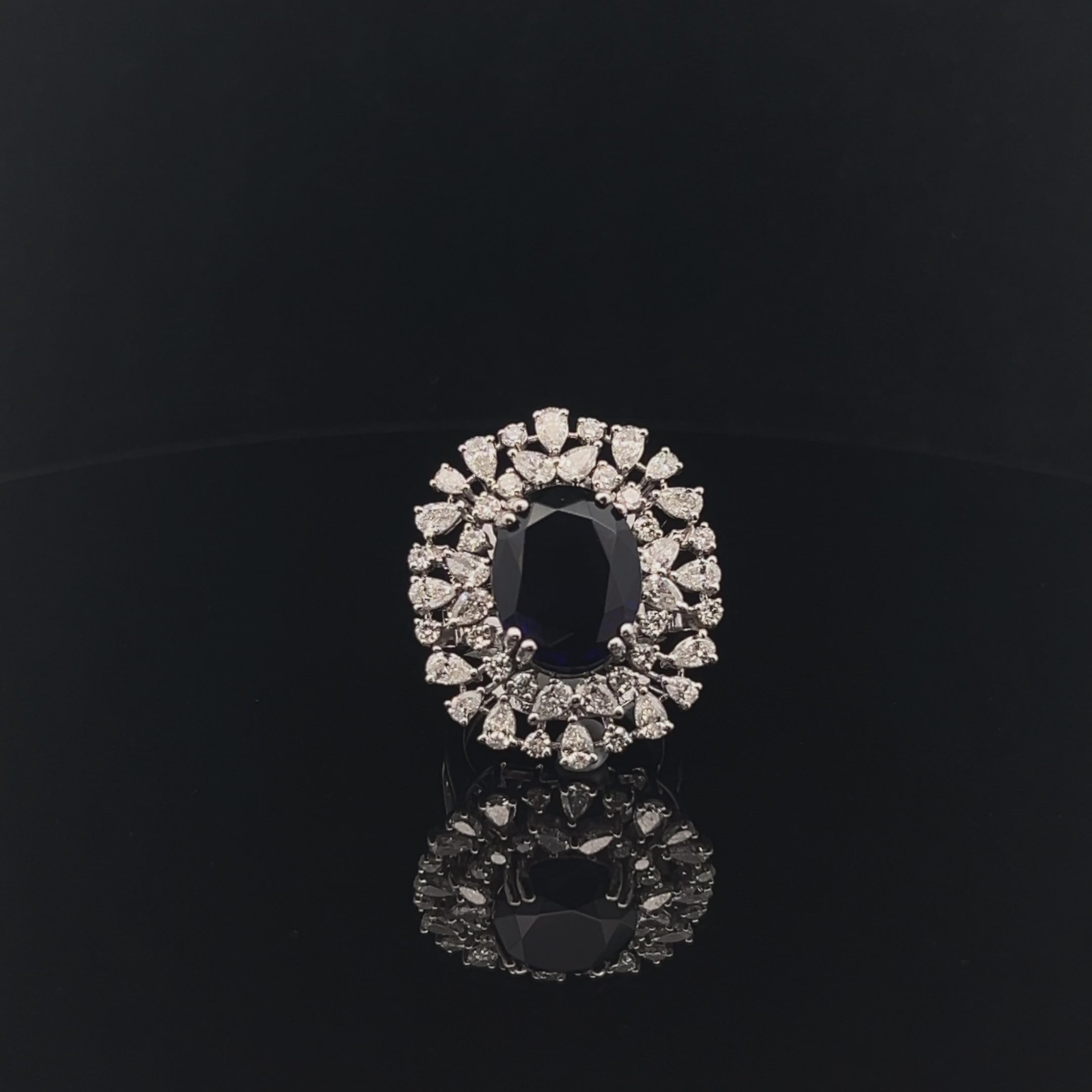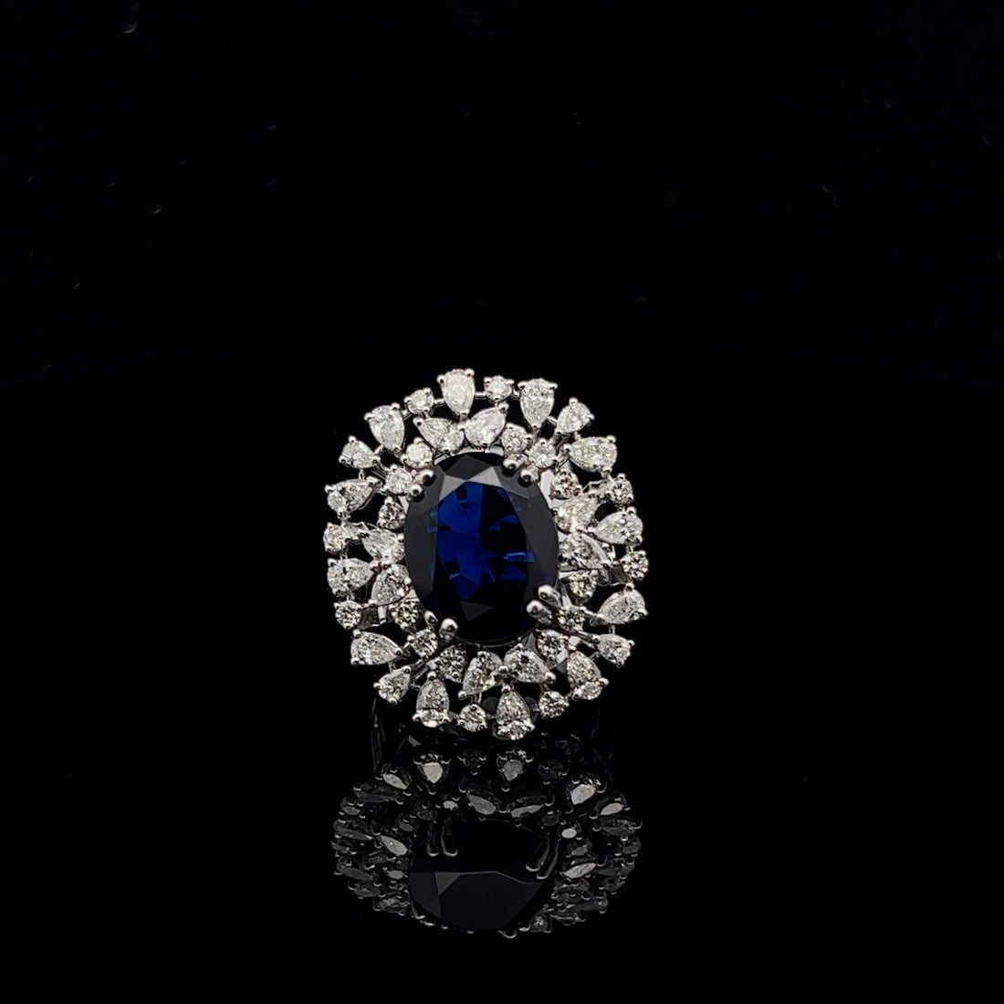 This exquisite sapphire ring features a stunning deep blue gemstone, encircled by a halo of sparkling white diamonds. Set against a sleek black background, the rich colors and dazzling brilliance create an aura of timeless elegance and sophistication. Perfect for special occasions or as a luxurious gift.