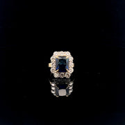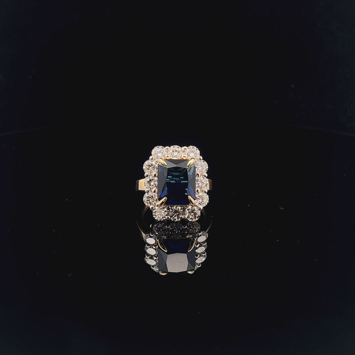 Discover the exquisite beauty of this elegant sapphire and diamond ring. The stunning central sapphire is surrounded by a halo of sparkling diamonds, creating a captivating contrast that catches the light beautifully. Perfect for special occasions or as a statement piece in your jewelry collection.