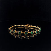 This exquisite gold bracelet showcases a stunning array of pear-shaped emerald gems, each meticulously set to perfection. The combination of the rich green stones and the lustrous gold creates an elegant and timeless piece, perfect for any occasion.