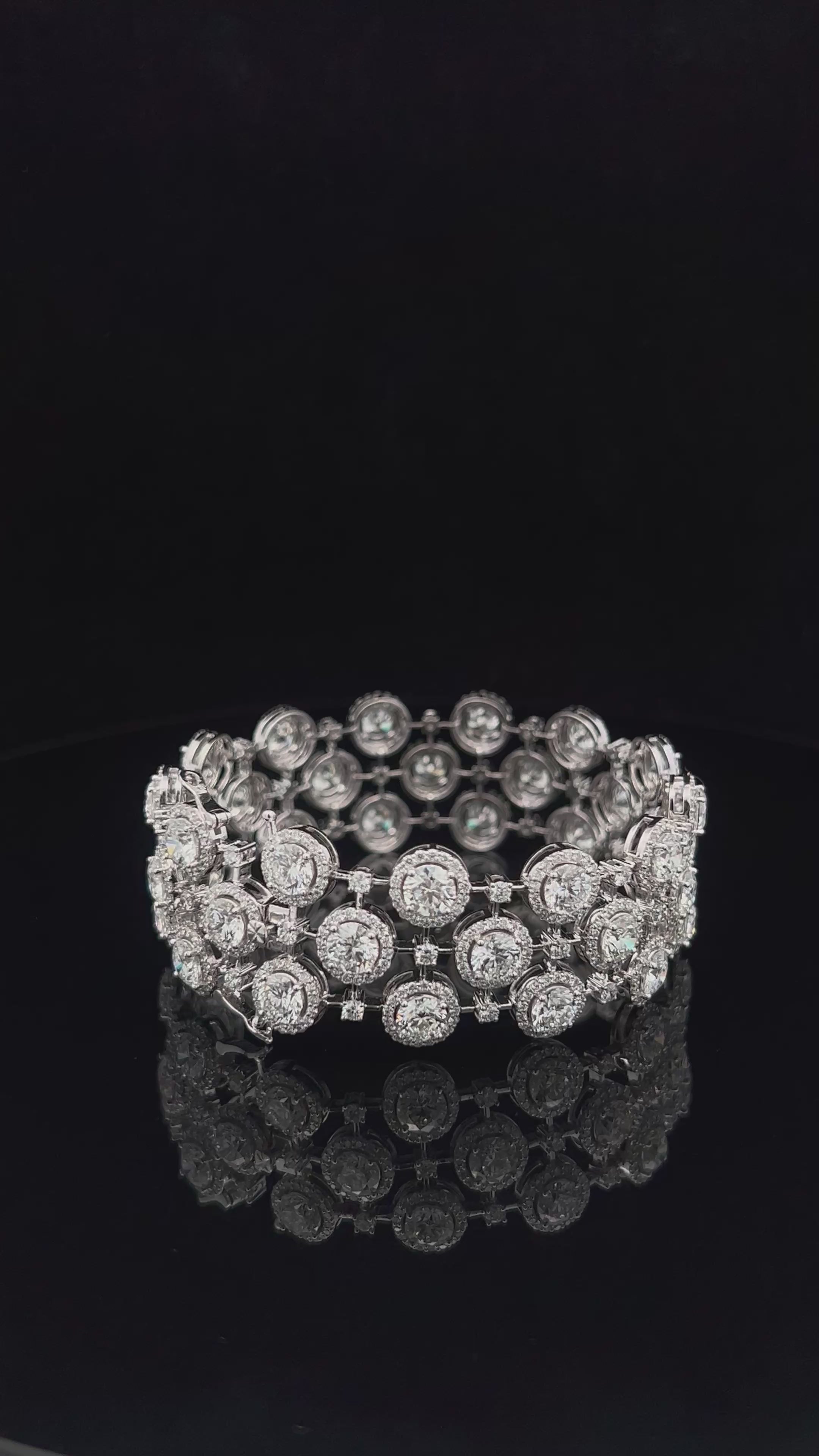 Experience a cascade of light with this stunning diamond cluster bracelet. Adorned with countless precisely cut diamonds, arranged in intricate halo settings across multiple bands, this bracelet captures and reflects light from every angle. Its substantial yet comfortable design ensures  a luxurious feel and a truly radiant presence on your wrist making it an unforgettable statement piece.