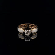 This exquisite diamond ring features a stunning solitaire set in a sophisticated band. The intricate detailing on the sides of the band adds a touch of elegance and craftsmanship. Perfect for engagements or as a statement piece, this ring is sure to dazzle and impress.