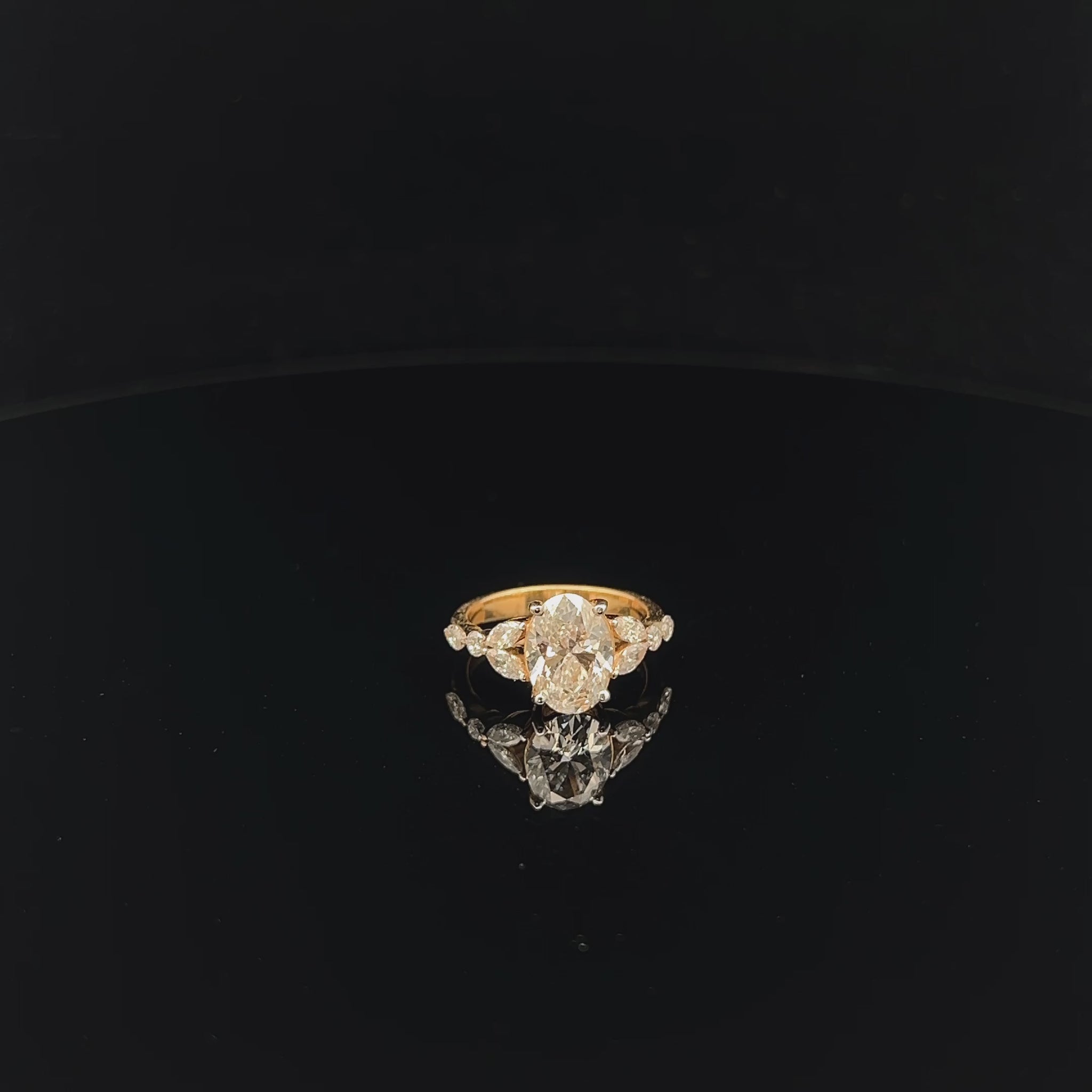 Exquisite multistone ring crafted in warm yellow gold. The ring features an oval cut diamond as its centerpiece, renowned for its brilliant facets and exceptional sparkle. This elegant ring showcases a timeless design, perfect for celebrating love and commitment.