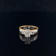 This exquisite diamond ring features a stunning central square-cut diamond, flanked by two dazzling smaller diamonds. The intricate gold band adds a touch of elegance and sophistication, making it the perfect piece for special occasions or as an engagement ring.