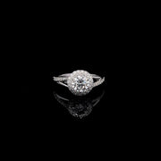 This exquisite diamond ring is a masterpiece of elegance and sophistication. The central diamond sparkles with unmatched brilliance, surrounded by a halo of smaller stones that enhance its radiance. The band features intricate detailing, adding to the overall allure of this stunning piece. Perfect for engagements or special occasions, this ring embodies timeless beauty.