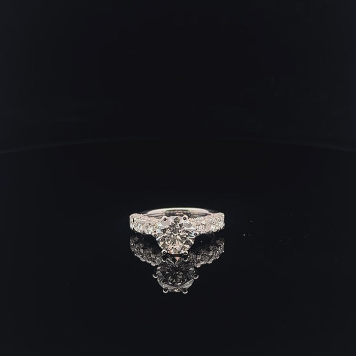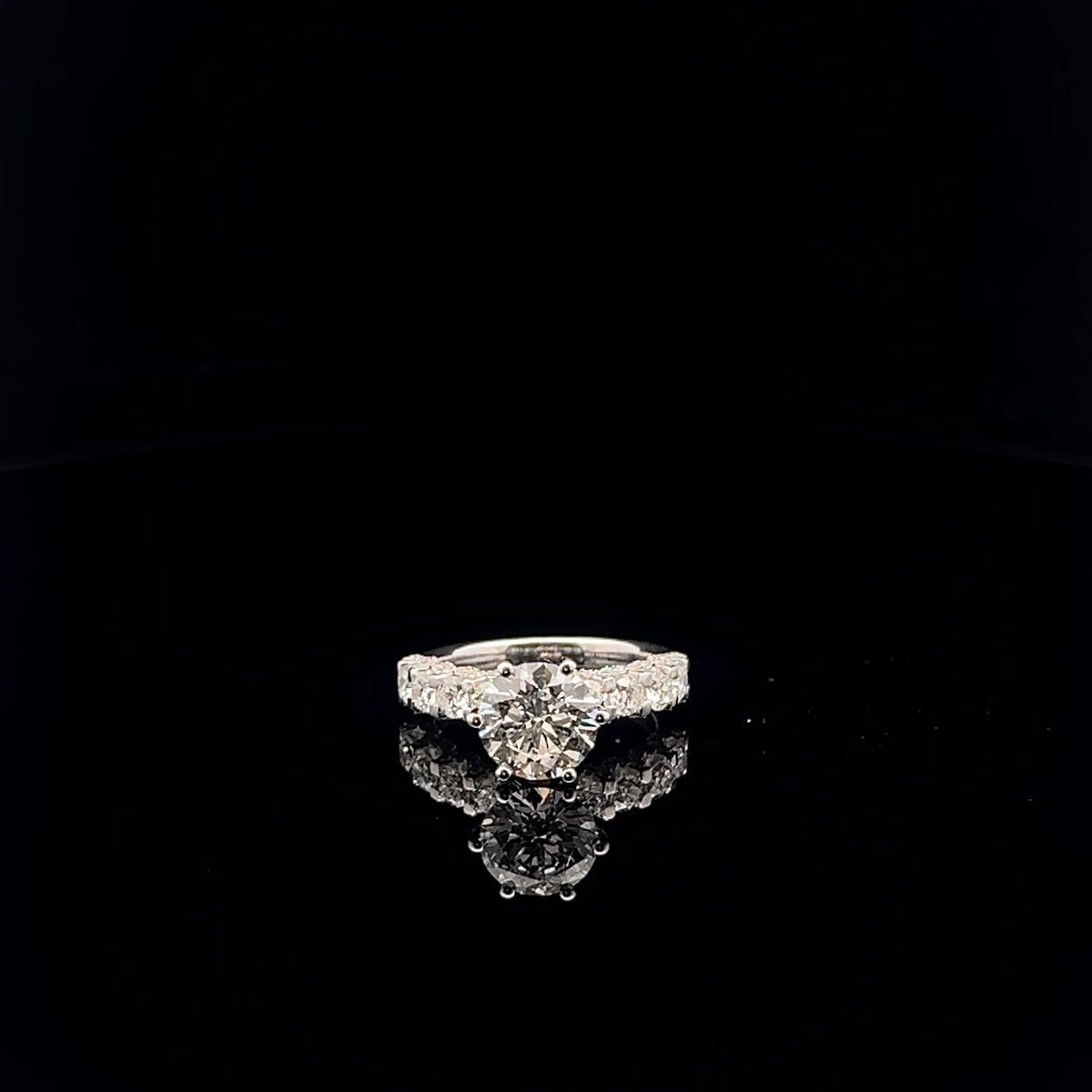 Exquisite multistone ring featuring a central round brilliant cut diamond, set in a lustrous silver band. Its composition showcases meticulous arrangement enhancing brilliance and fire, complemented by smaller diamonds along the shank, ensuring exceptional sparkle.